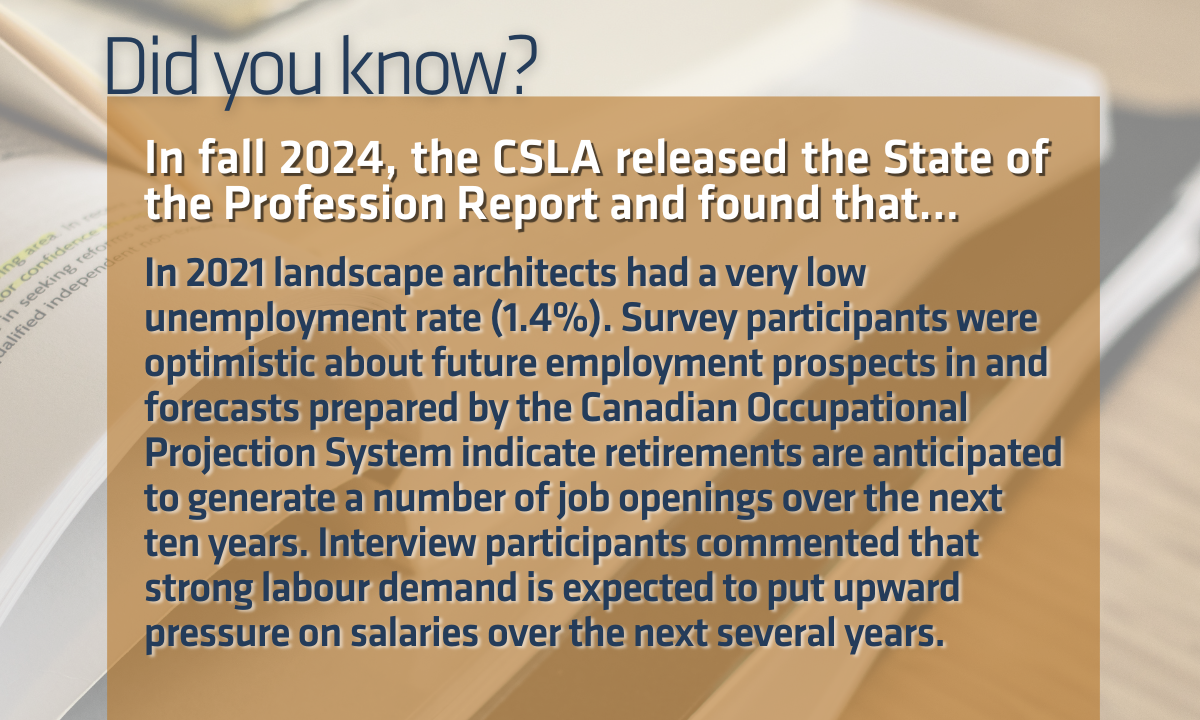 This fall, the CSLA released a report on the state of the profession of landscape architecture by Winnipeg-Based Firm InterGroup Consultants. The report presents information which will:
