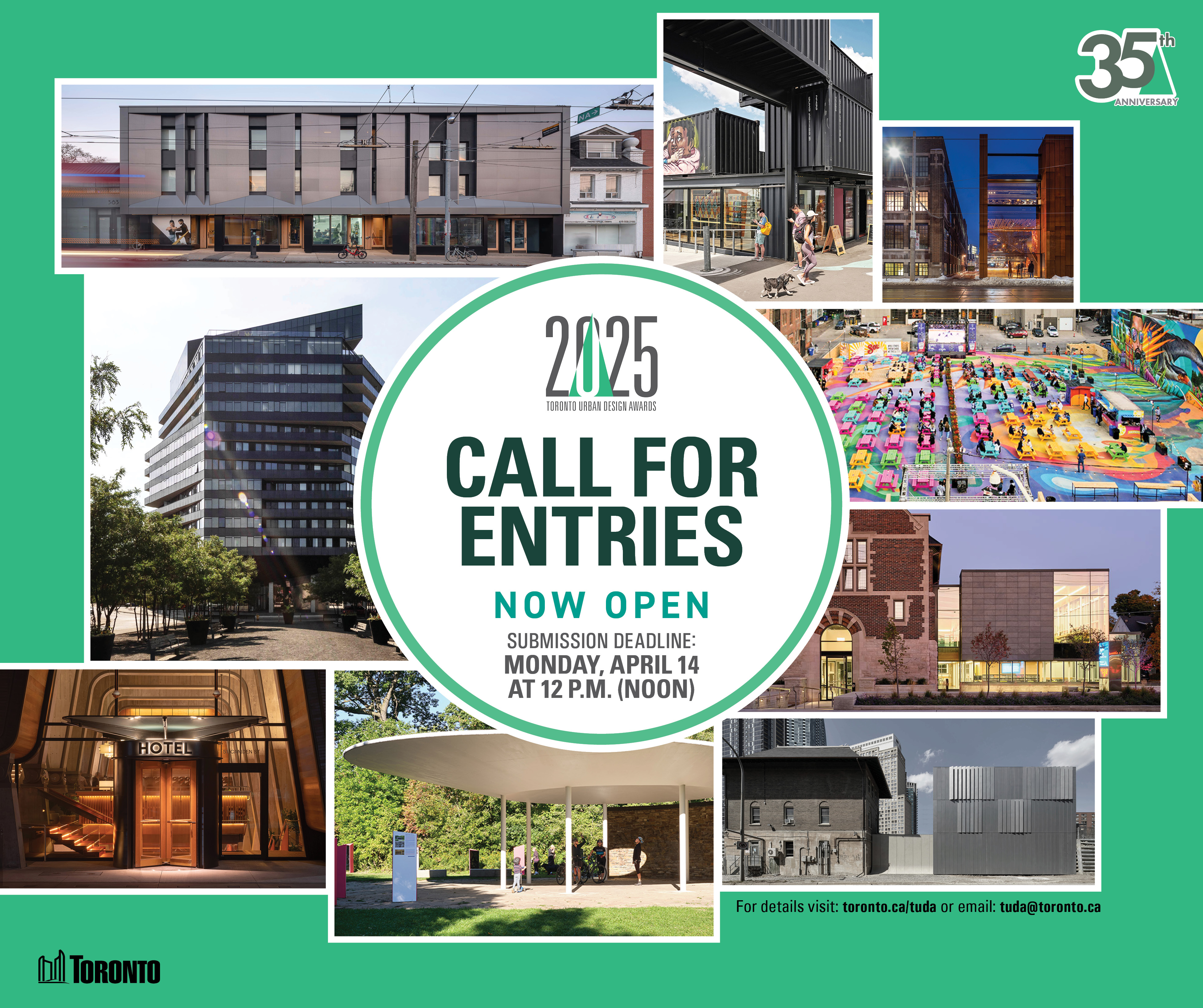 Submissions are now being accepted for the 2025 Toronto Urban Design Awards. The call for entries deadline is April 14 at 12 p.m. (noon). The awards recognize the significant contribution that architects, landscape architects, urban designers, artists, design students and city builders make to the look and livability of our city. Project entry details and program information is available at www.toronto.ca/tuda
