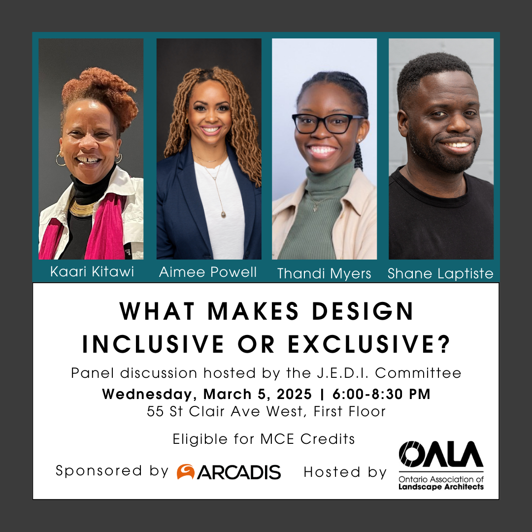 OALA's J.E.D.I. Committee is hosting a panel on the ways in which design influences inclusivity or exclusivity through our representation, the way we work, engage with our stakeholders, and the programs and policies that drive design. Join to hear from Black design professionals who will provide their perspectives on the issue.