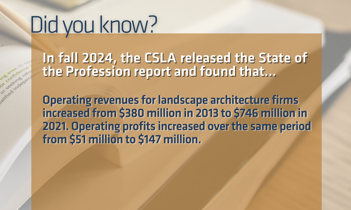 Did You Know that operating revenues for landscape architecture firms increased from $380 million in 2013 to $746 million in 2021? Findings from the State of the Profession Report