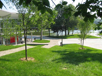 The project, which renews the site language, is an excellent example of preservation and development of a modern landscape. The approach says the assembly of three periods of construction: the clearing Olmsted 1872, Lake Todd in 1938, the roof and its square in 1958. Thus the fluid lines, the undulating volumes and materials (concrete and flat stones) typical of the language of today draw and fit them to the clearing program elements. The floor of modulation corresponds to the relief work of the clearing designed by Olmsted, hiding under her undulations accessible technical gutter and a technical building. The graceful curves of the ice, the court of the adjacent pavilion and traffic areas open onto the lake. They are highlighted by an apparatus of flat stones that evoke the mountain with its rustic and rough appearance in contrast to the silky lawn. The arrangement of the irregular clumps plantations softens the landscape. The choice of plant species helps to maintain biodiversity of the mountain. The area is dotted relief groves of trees and rocky outcrops in respectful composition of its historical heritage.