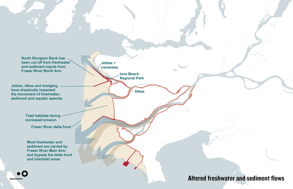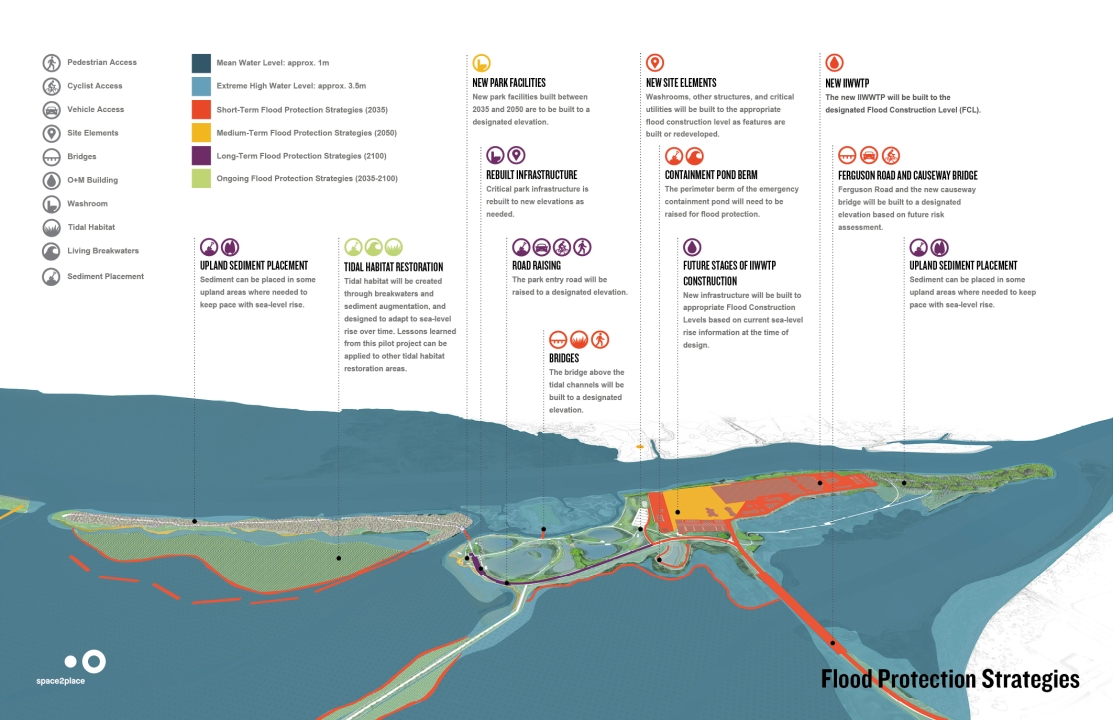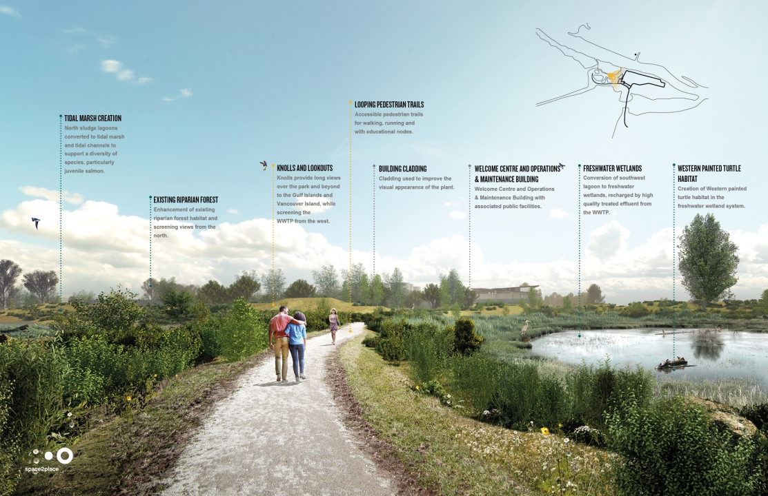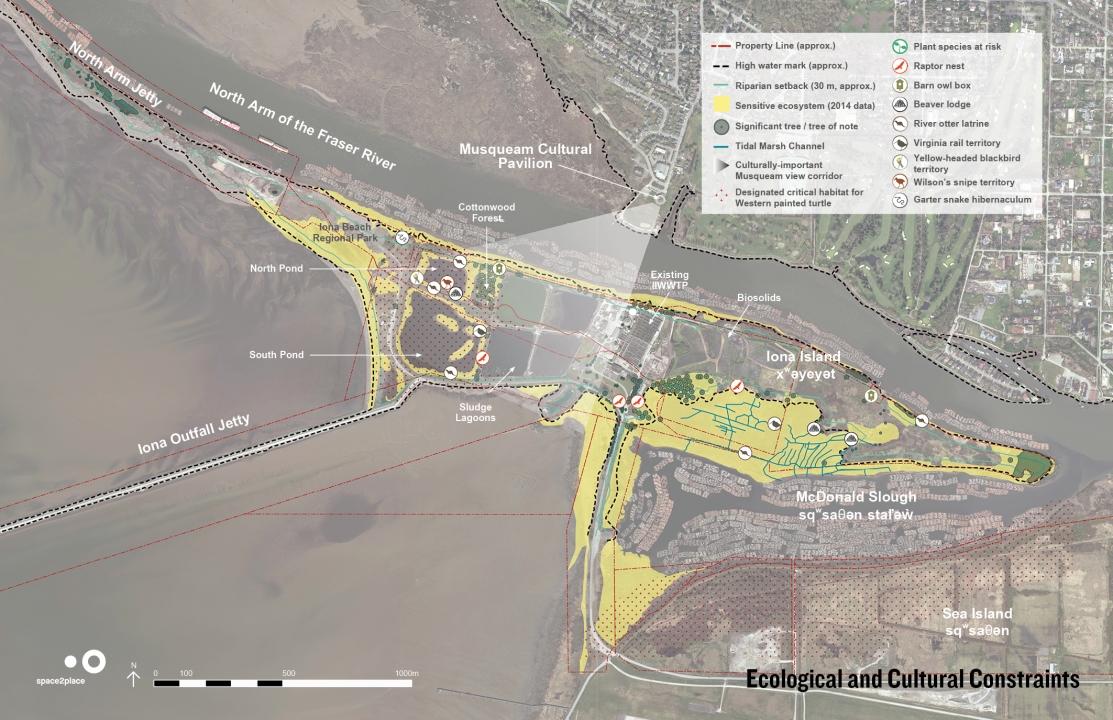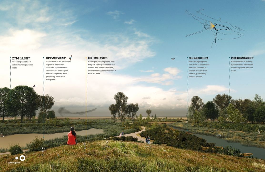 The Iona Island Wastewater Treatment Plant (IIWWTP) occupies a complex site of intersecting human and ecological systems. Since the early 1900s, infrastructure in the Fraser River Estuary has disrupted natural estuary processes, directly impacting juvenile salmon and other species. The IIWWTP Projects will upgrade the existing treatment plant with a complementary range of ecological restoration projects. These projects will reconnect the river and sea, create off-channel habitats, regenerate and expand freshwater wetlands, and restore upland terrestrial habitats. Ecosystem-based, flood-protection strategies will also be implemented to increase Iona Island’s resilience to sea-level rise. The Conceptual Design for the IIIWWTP Project was developed through a multidisciplinary integrated design process and with input from Musqueam Indian Band (xʷməθkʷəy̓əm/Musqueam), neighbours and stakeholders. This project is a transformative opportunity to integrate urban infrastructure with ecological restoration, climate change adaptation and Indigenous reconciliation to create a significant and ongoing legacy for the region.