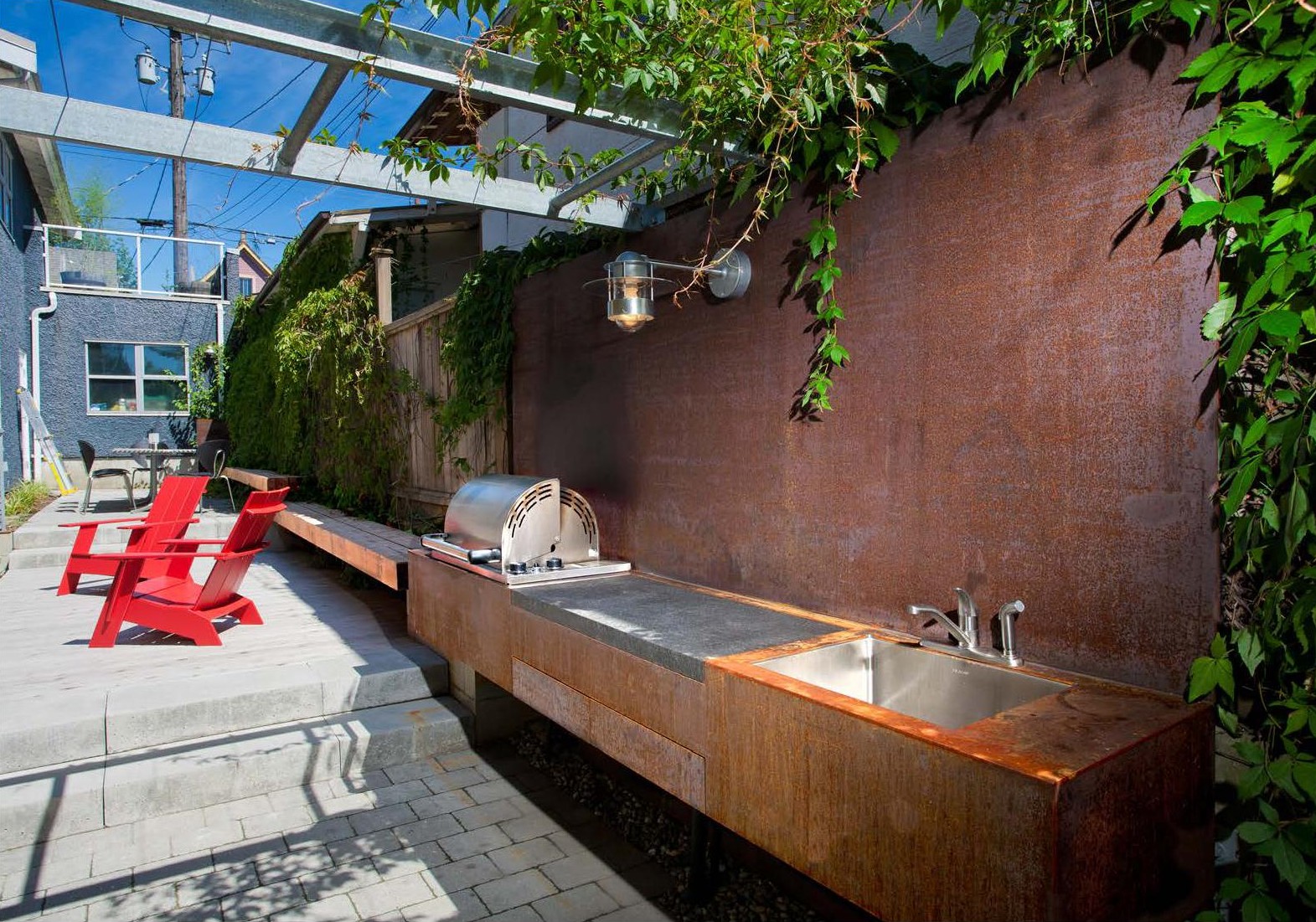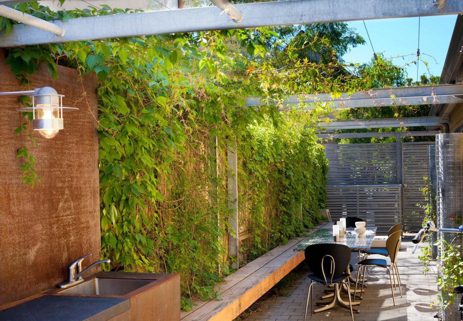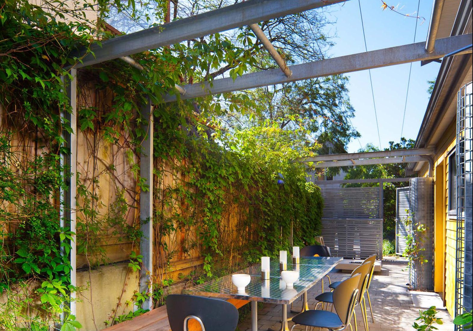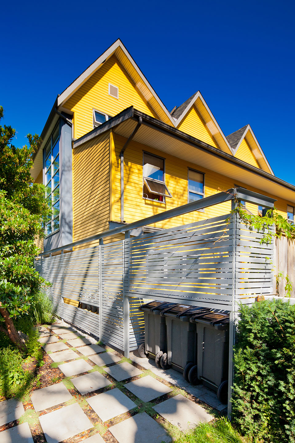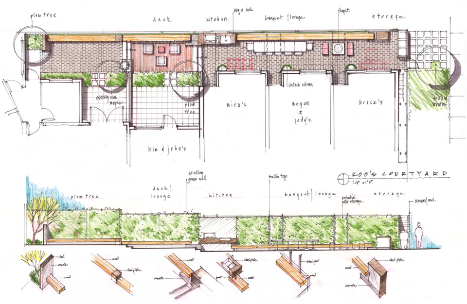 Tying together six townhouses on the site of an old autobody shop in Vancouver’s Strathcona neighbourhood, Koo’s Courtyard provides a small community with its social heart. The design challenge was to make a virtue of the narrow space, which has a width of 2.8m for most of its length. With six fenced private patios, overgrown shrubs and bulky stormwater barrels, the dysfunctional existing garden area left little room for anything else. Hapa’s first move was to clear the clutter and reveal the potential for communal use. In this respect, we were privileged to work with an enlightened client group that was ready to move from the typical backyard archetype to a new social paradigm.