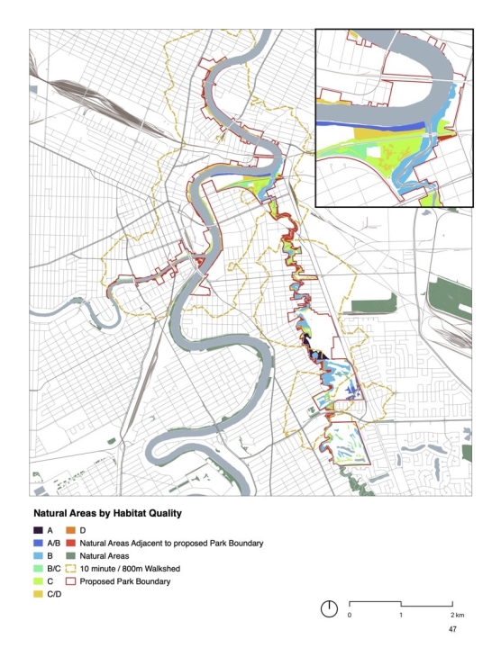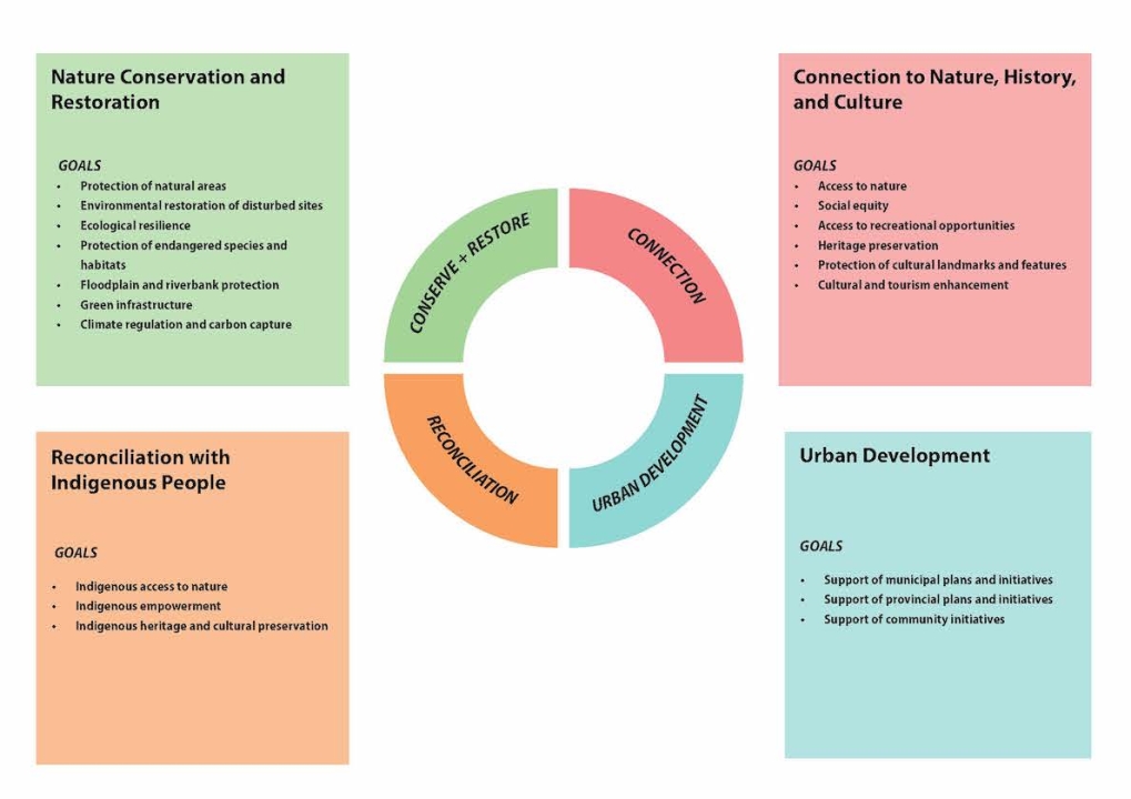 To support this proposal, a year-long research initiative coordinated the partnering of community organizations throughout the planning process. It developed the park proposal and established benefits related to four contribution areas: protection and conservation of nature; access to nature, recreational, cultural, and historical features; reconciliation with Indigenous communities; and support of municipal urban development initiatives.
