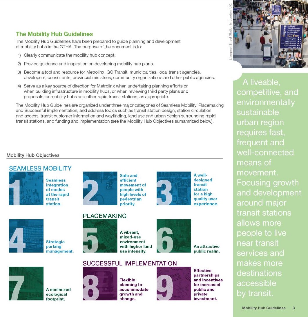 In 2011, Metrolinx released the Mobility Hub Guidelines, a set of multi-disciplinary guidelines that communicate the mobility hub concept and provide guidance for mobility hub and station planning and development efforts. They represent an innovative and comprehensive tool, organized under nine key objectives in three categories. The Guidelines provide detailed approaches, best practices, case studies, and suggested resources to direct planning and development at these centres of activity that attract opportunities to live, work, and play.