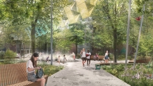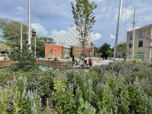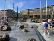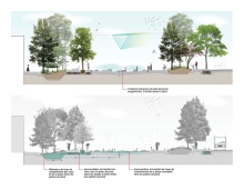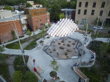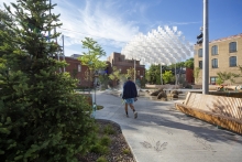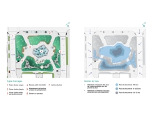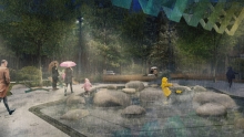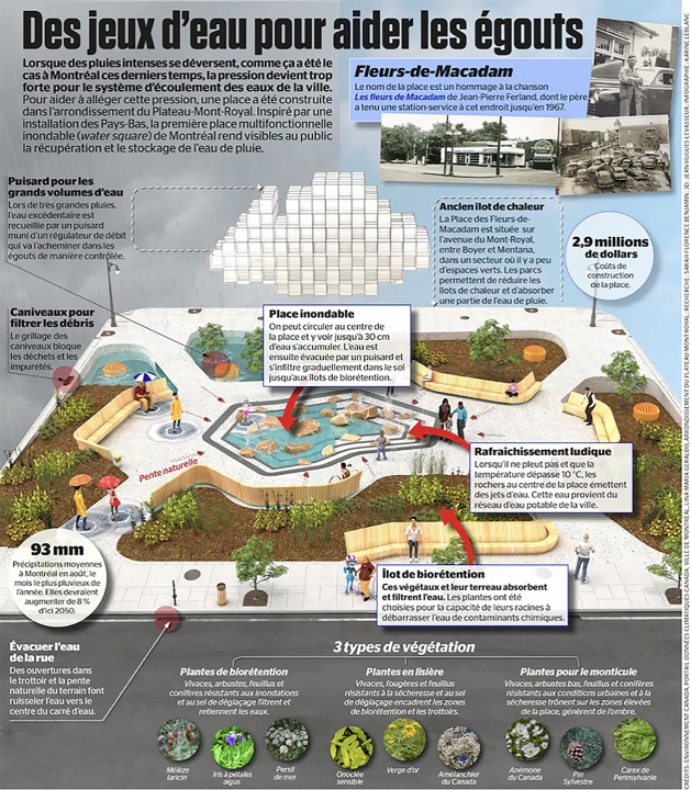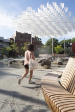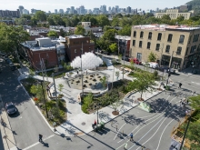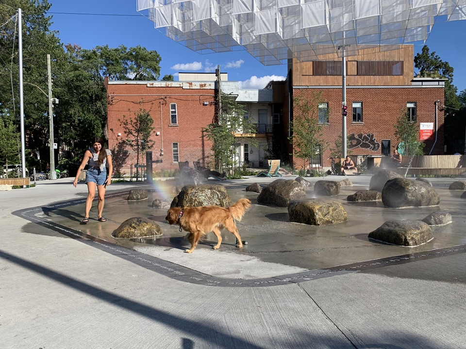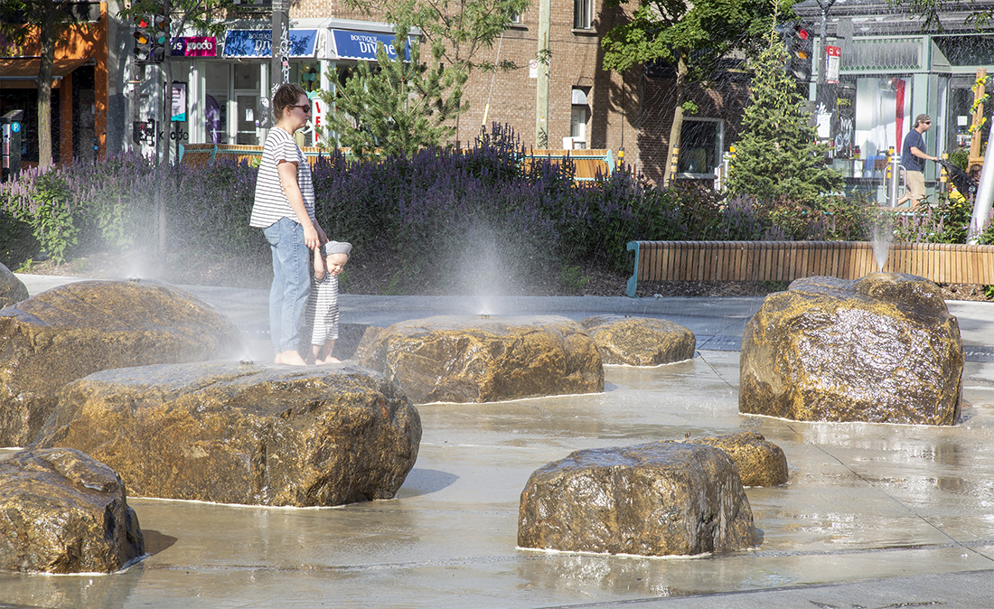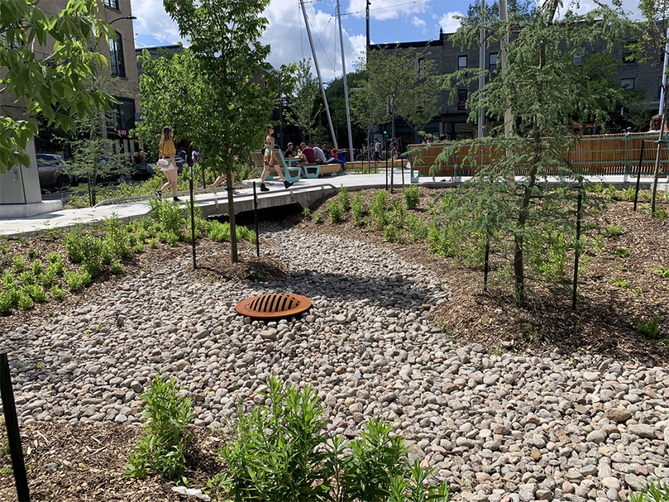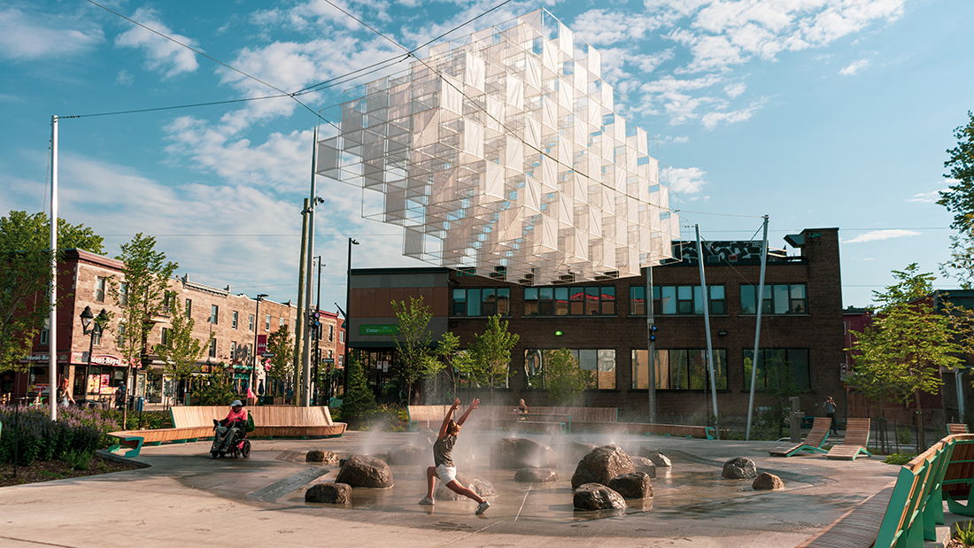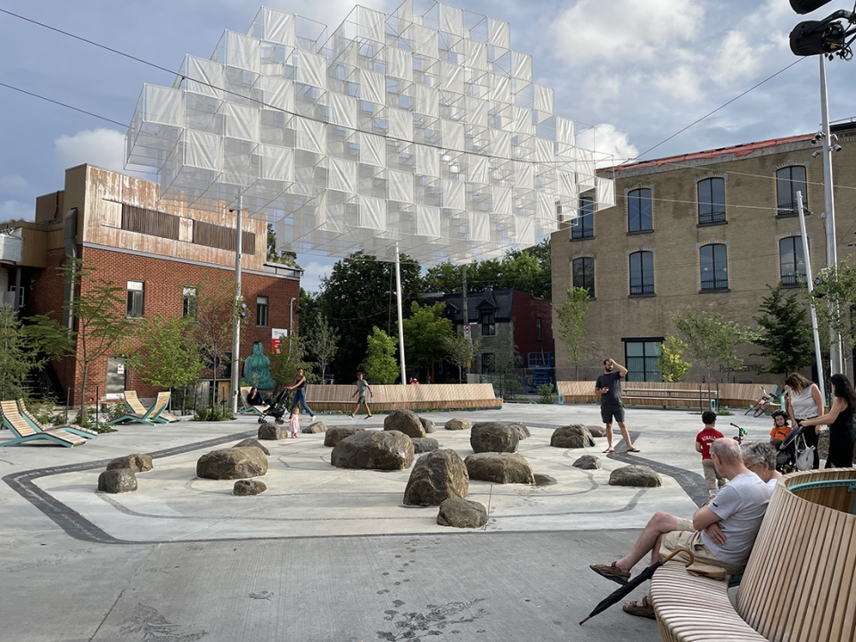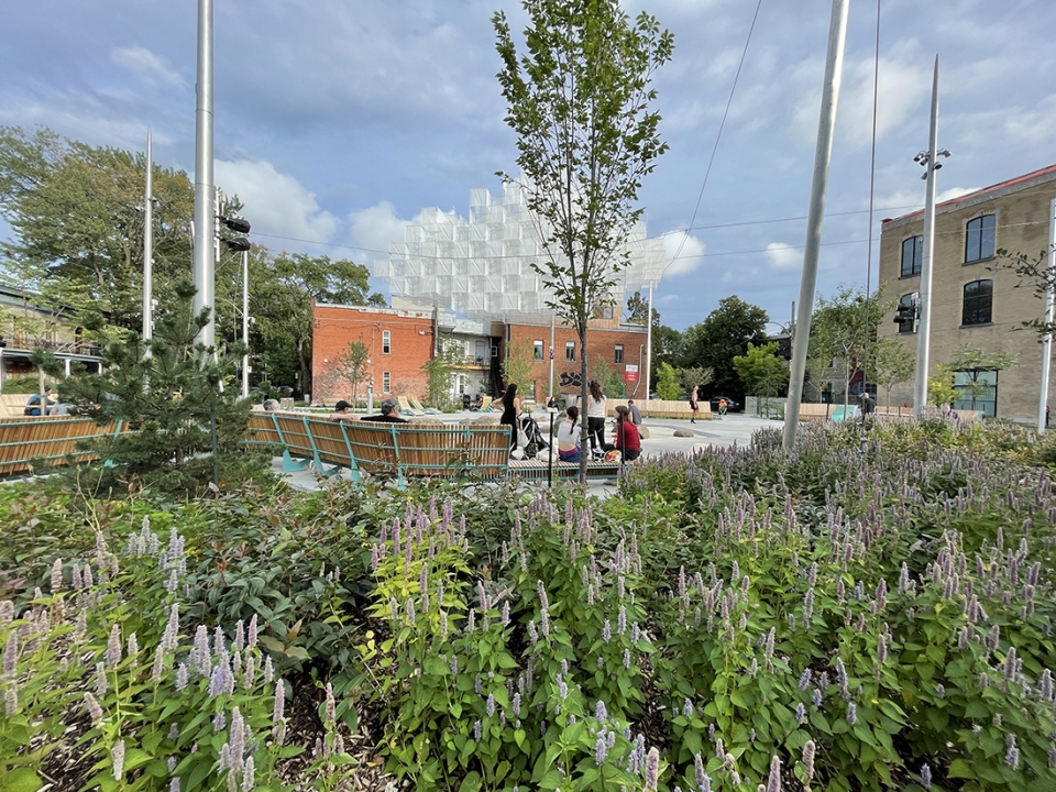 The creation of a new public square in the heart of the borough of Plateau-Mont-Royal converted the site of a former service station into a greenspace. The project represents a new way to design public space, leveraging its potential for the in-situ management and treatment of runoff in an urban area, making it one of the city’s first water squares. In addition to being a space with built-in resiliency to flooding linked to climate change, the space brings to life and pays tribute to the song “Les fleurs de macadam” (“pavement flowers”) by Jean-Pierre Ferland, whose father operated the service station on the site in the 1950s. It is the result of a four-year participatory process led by the Castor et Pollux firm, including a series of temporary designs that informed the design process for the peaceful yet lively site. An immersive programmable rain fountain that alternates between real and metaphorical rain depending on the weather, a ribbon of strategically varied benches arranged to encourage quiet contemplation, along with suspended luminous art all change with the seasons, making this an irresistible space.