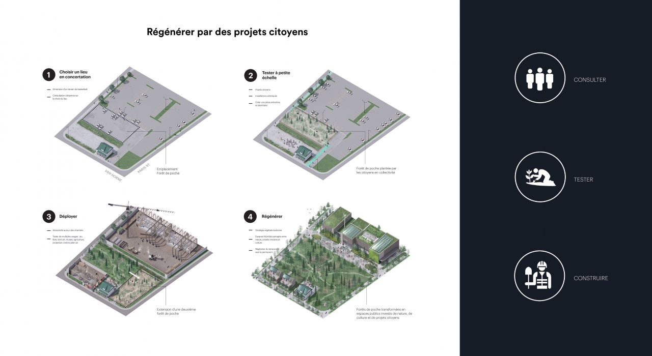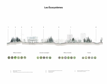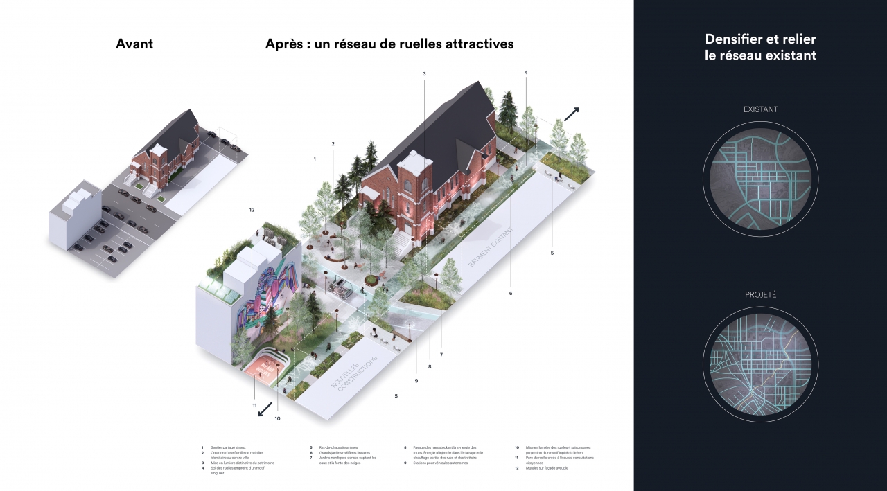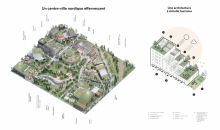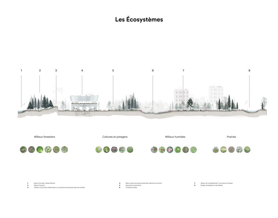 The Sève project is an urban planning vision for downtown Sudbury in 2050. This project allows us to imagine the city and its potential for urban development, as much in the reconnection of large-scale networks as in pedestrian circulation. The enhancement of the landscape, industrial and cultural heritage is the basis of this major urban project. Inspired by the Nordicity, by the re-greening actions already in place and by cultural diversity, several implementations are proposed: new housing that makes room for urban agriculture; a green and blue grid and ecological and responsible water management; energy self-sufficient buildings and circular economy; eco-systems in harmony with nature; a city that encourages active transport; responsibly sourced local materials that support the local economy; inclusive living environments; integration of biophilia in buildings; reduction of noise pollution and stress through pedestrianisation. This 30-year urban planning project, developed by both urban planners and citizen committees, will allow Sudbury's downtown to develop into a model of urban regeneration. Landscape architecture is an exceptional medium, as it addresses a broad spectrum of fields, including design, social sciences, ecology and urban planning. This project addresses the interrelationship of all these considerations to create a unique, powerful and innovative vision.