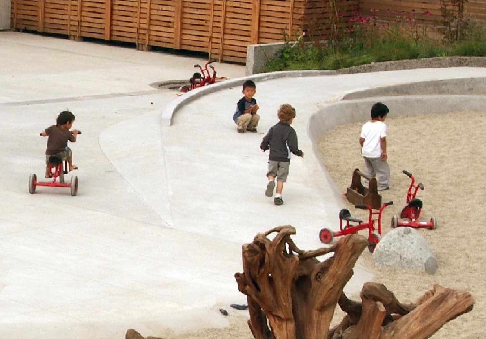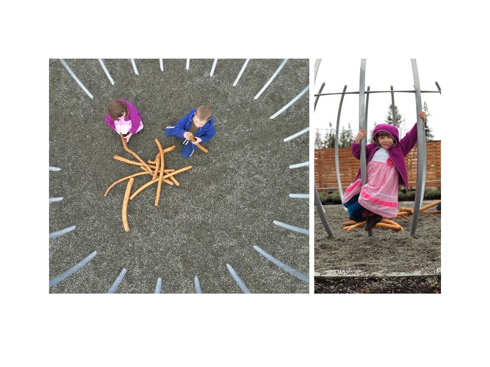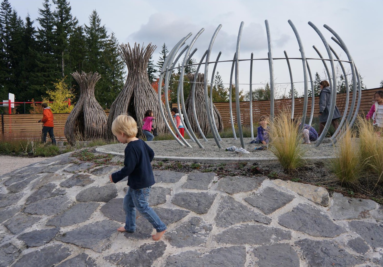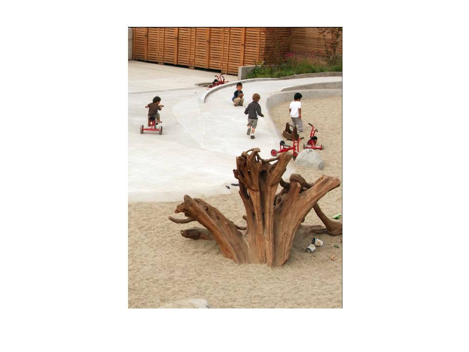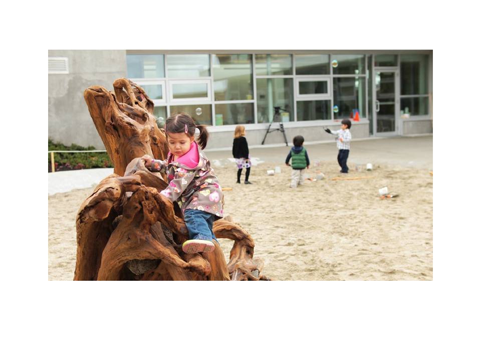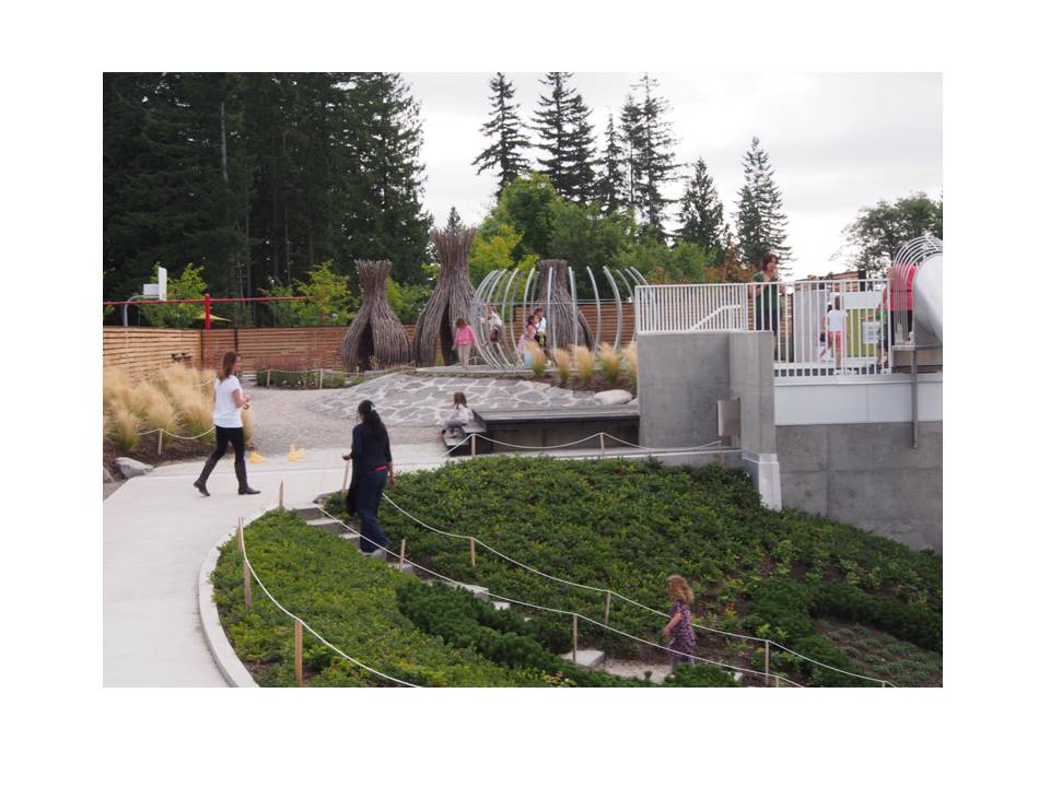 The SFU Childcare aspires to be the most sustainable building in Canada. The facility harvests and cleanses its own water, generates its own energy, and provides a dynamic landscape for exploration, experimentation and self-expression. Children play in whimsical woven huts, follow the path of rainwater, and enjoy sliding from the rooftop to the play area below.