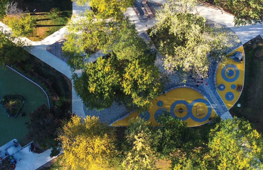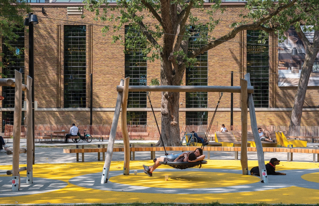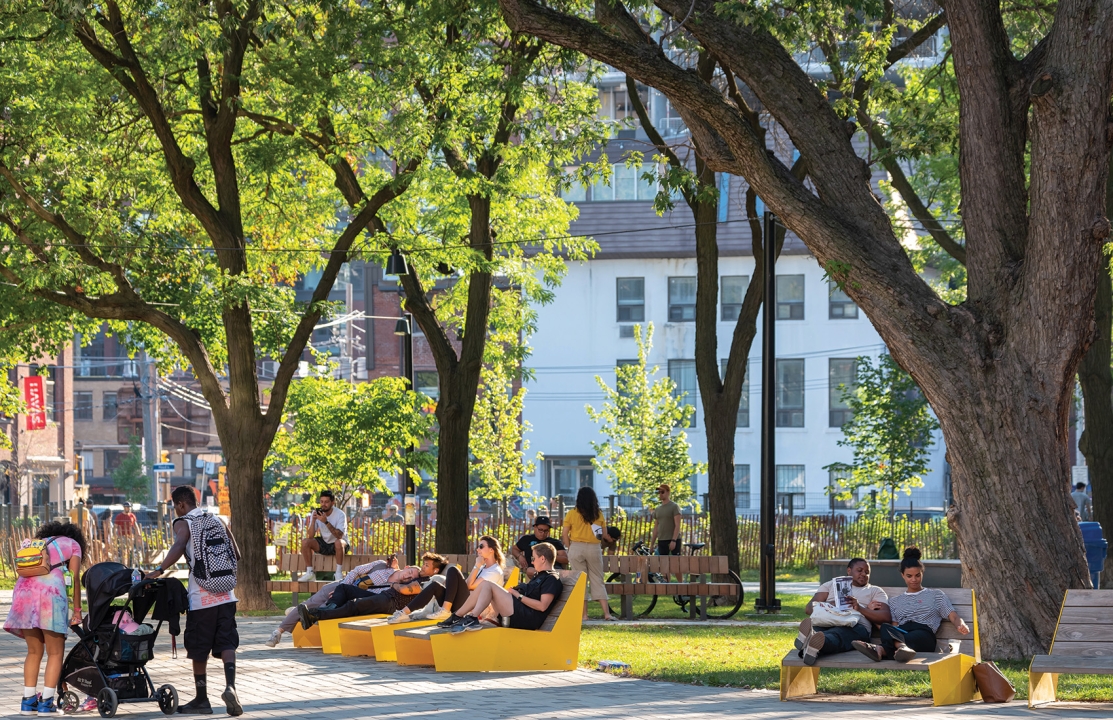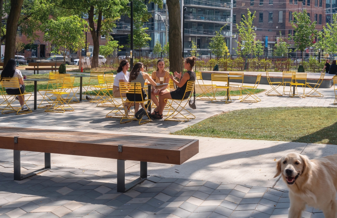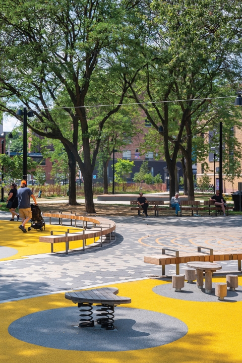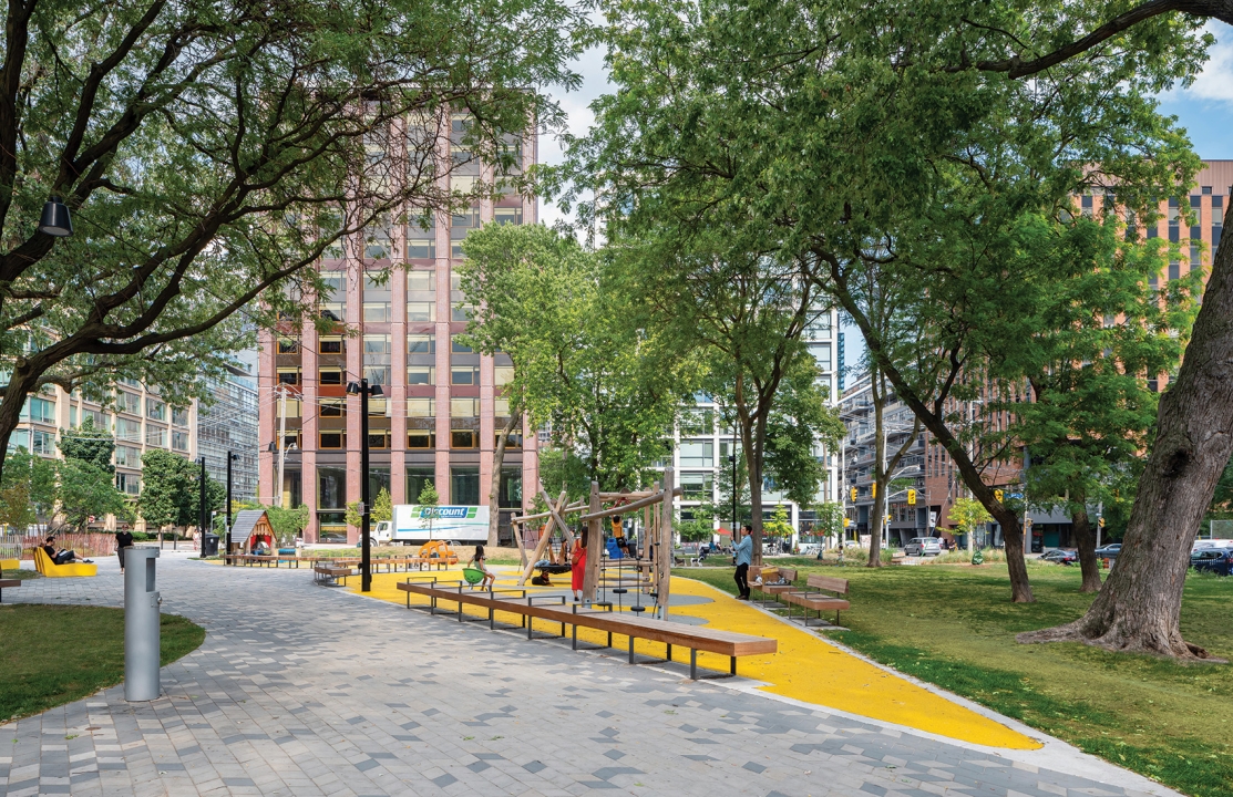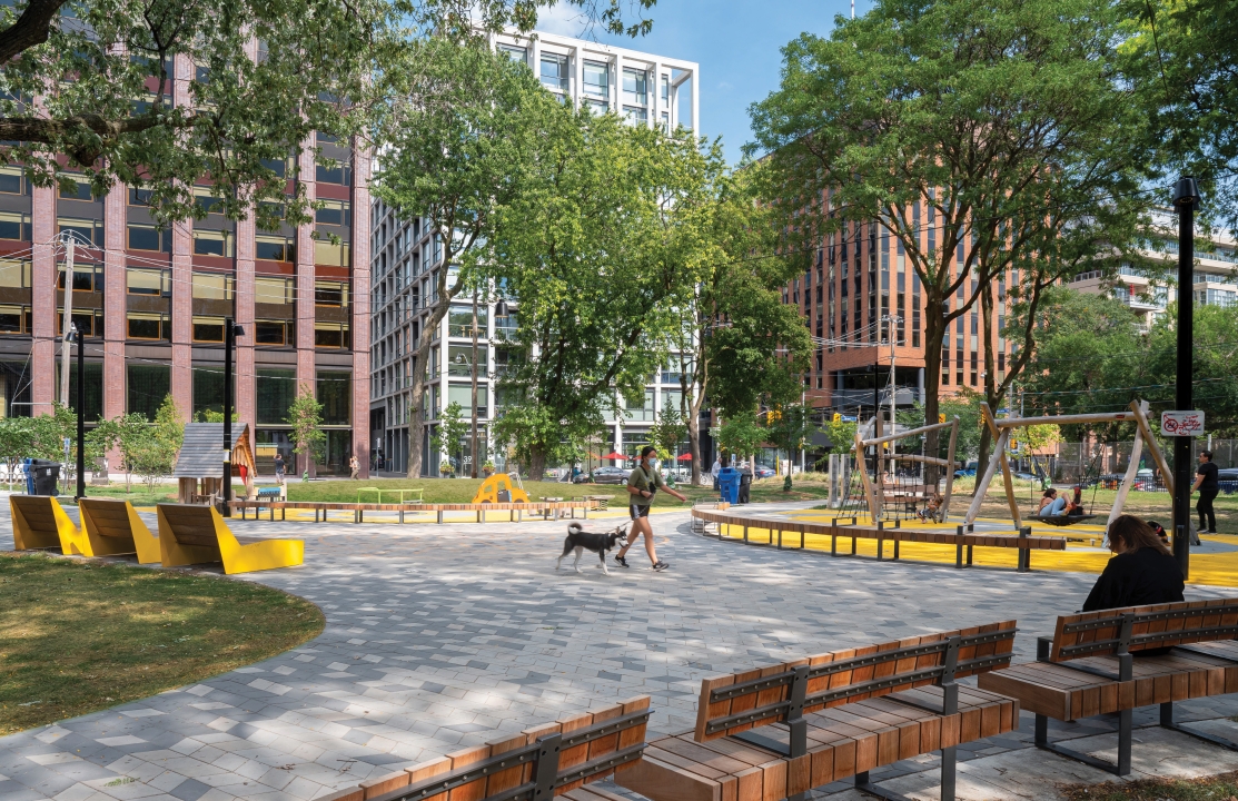 Nestled into Toronto’s dense and lively Fashion District is the re-imagined St. Andrew’s Playground Park – a newly renovated playful landscape that infuses much-needed green space that serves the fast-evolving social and recreational needs of the adjacent community. The first designated public playground in Toronto (1908), St. Andrew’s Playground Park has been transformed into a well-loved, thriving urban destination. A reorganized ground plan introduces new seating, accessible paths, a central plaza, a playground and an upgraded dog off-leash area with catenary lighting above, creating a safe and welcoming outdoor hub. Whimsical bright yellow accents unify the space – from the colourful surface treatment of the playground, to the generously scaled lounge chairs and site furniture. The mature trees are maintained and protected, supplemented with a robust urban forest succession planting plan. The canopy becomes a major park feature, providing shade and dappled light for comfort and beauty in the revitalized park.