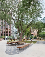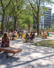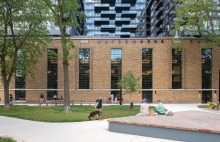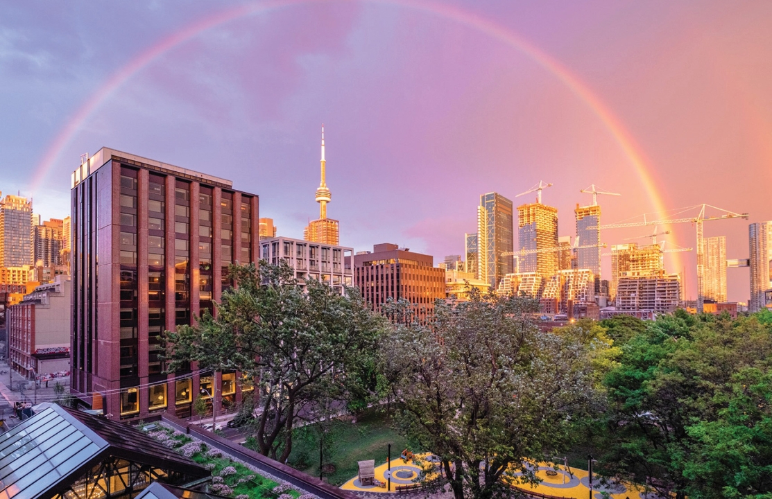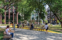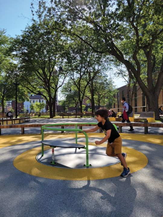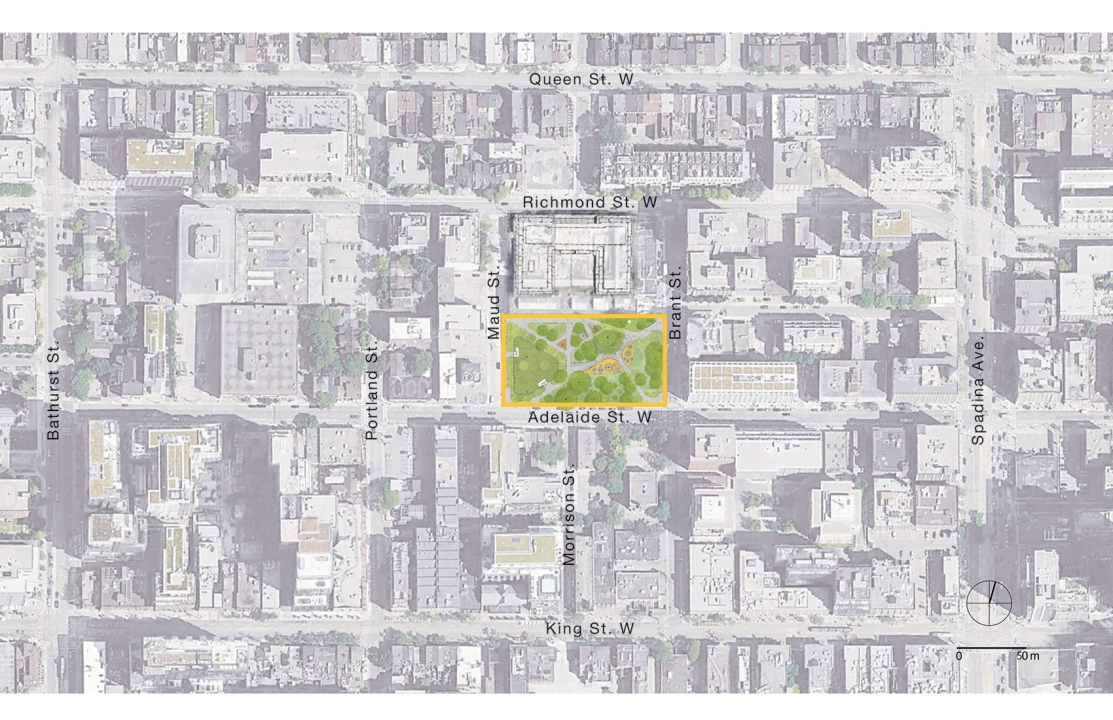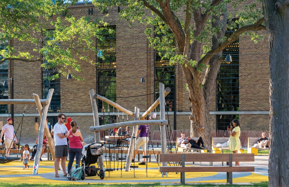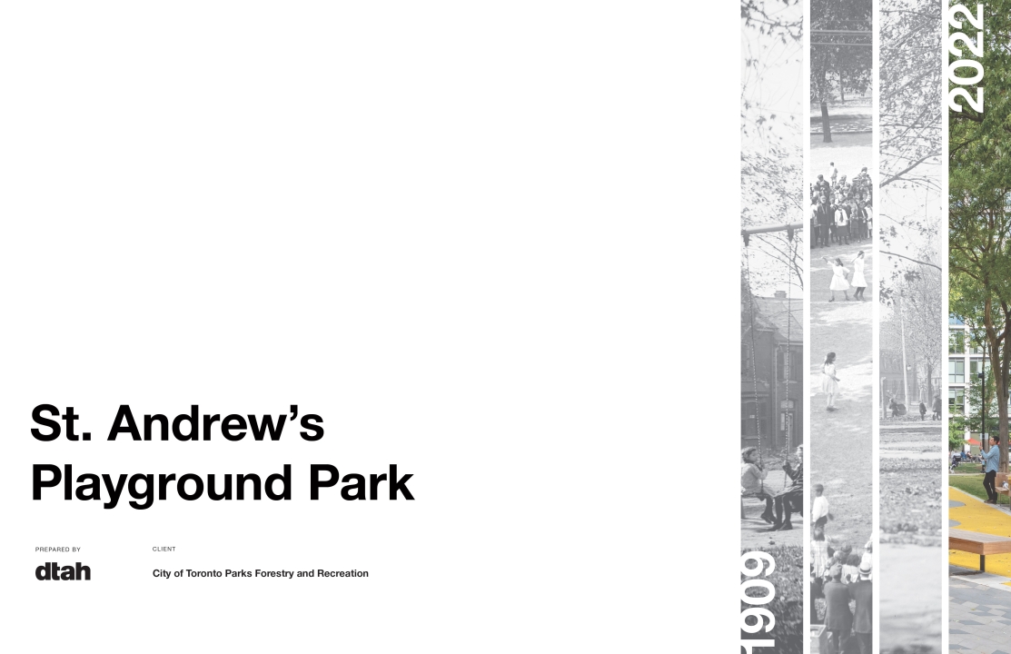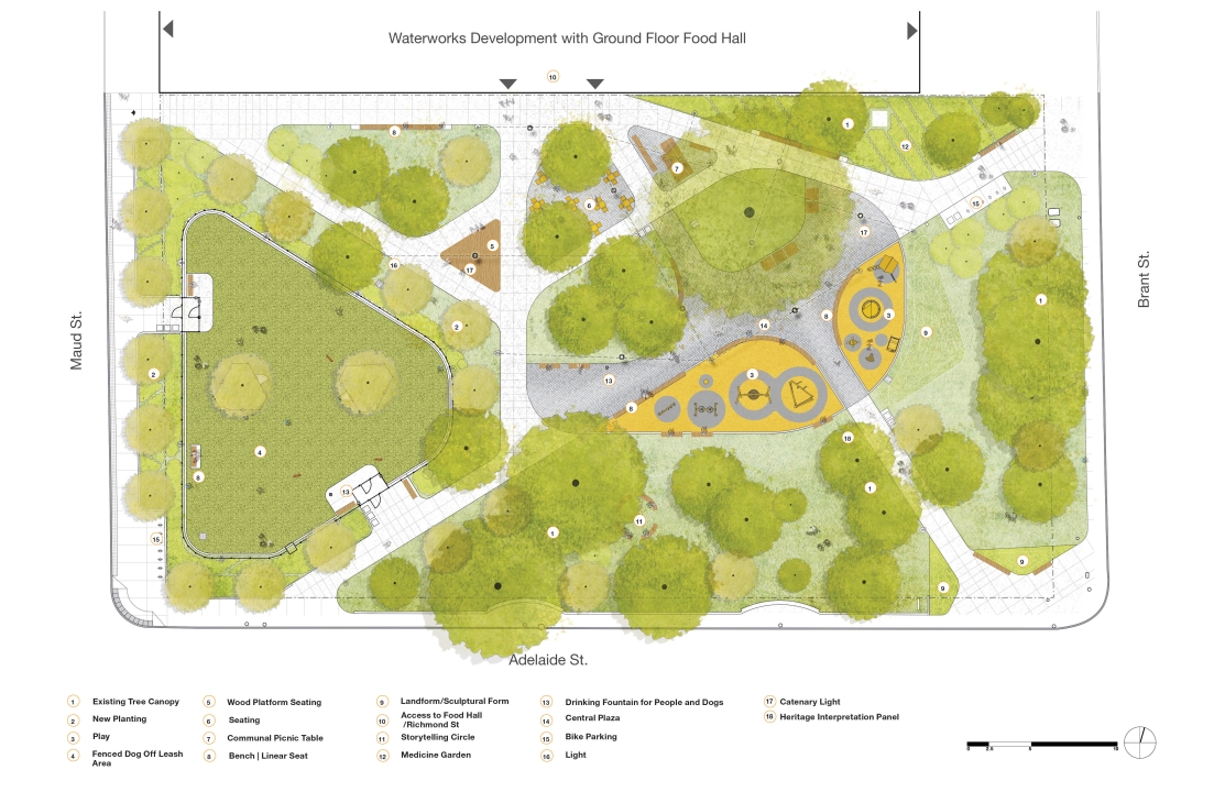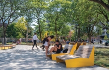 Nestled into Toronto’s dense and lively Fashion District is the re-imagined St. Andrew’s Playground Park – a newly renovated playful landscape that infuses much-needed green space that serves the fast-evolving social and recreational needs of the adjacent community. The first designated public playground in Toronto (1908), St. Andrew’s Playground Park has been transformed into a well-loved, thriving urban destination. A reorganized ground plan introduces new seating, accessible paths, a central plaza, a playground and an upgraded dog off-leash area with catenary lighting above, creating a safe and welcoming outdoor hub. Whimsical bright yellow accents unify the space – from the colourful surface treatment of the playground, to the generously scaled lounge chairs and site furniture. The mature trees are maintained and protected, supplemented with a robust urban forest succession planting plan. The canopy becomes a major park feature, providing shade and dappled light for comfort and beauty in the revitalized park.