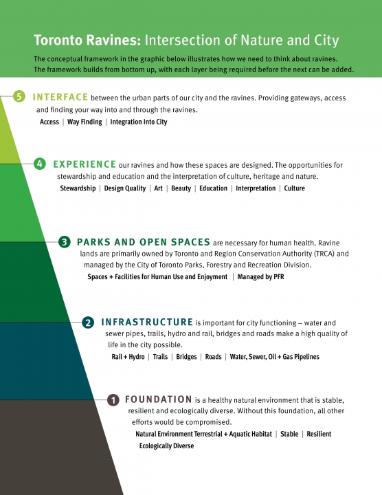 Toronto's Ravine Strategy is the first comprehensive, intentional and coordinated vision and strategy for the 11,000 hectare ravine system. It will align efforts and investments across disciplines for greater impact to achieve a bold vision for these extraordinary places so they can be enjoyed for decades to come.