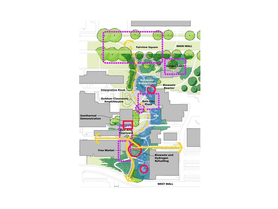 This project implements a working model of sustainable public realm design that showcases sustainability initiatives at UBC - Canada’s leader in campus sustainability research and practice. The Sustainability Street project brought together various university departments, including faculty, staff, and operations, to enhance the function and coherence of the public realm. Existing site conditions were thoroughly analyzed and then carefully matched to the program elements proposed for the site. The result is an innovative public space that connects people, ideas and environmentally-focused technology. Sustainability Street addresses the challenges of an increasingly urban world, demonstrating closed-loop solutions for collecting storm water, treating wastewater and generating energy.