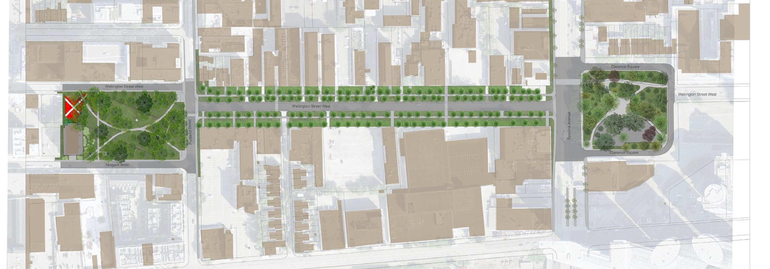Wellington Place is a noteworthy example of a successfully restored culturally significant district in a rapidly evolving mixed use area in an historic area of downtown Toronto. The initiative was spearheaded by the Wellington Place Neighbourhood Association who saw these lost and neglected public spaces as a important neighbourhood asset for their changing neighbourhood. Once industrial area of the city adjacent to the railway tracks, it has become one of the cities most desirable mixed use neighbourhoods with thousands of new residents. The implementation of Wellington Place has been implemented in three phases.