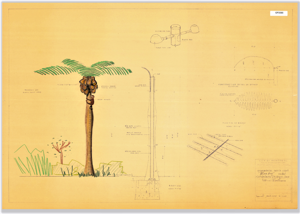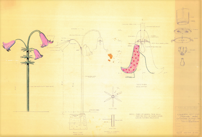 - Lafontaine Park, 1957-59. (Projects designed by Warner Goshorn; drawings Maurice Hamel) 2A Children’s Zoo, Ornamental Safety Light: Monkey Model; 2B Proposed location of Monkey House; 2C Party Patio. possibly 2D Ornamental Safety Light: Flower Model; 2E Totem Pole